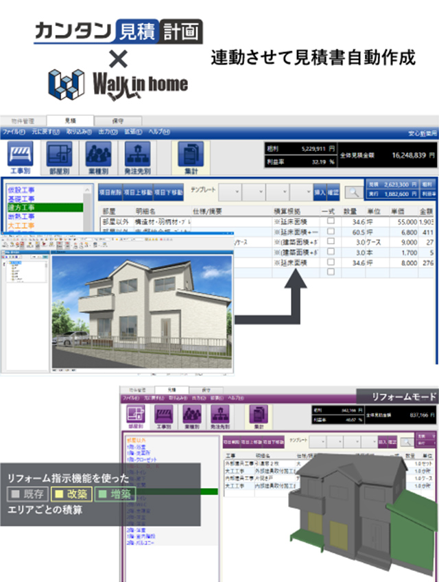 リフォーム専用モードでは「Walk in home Plus」のリフォーム指示機能との連動で、改築や増築エリアをそれぞれ部屋別に見積りができ、同時に実行予算も確認できます。